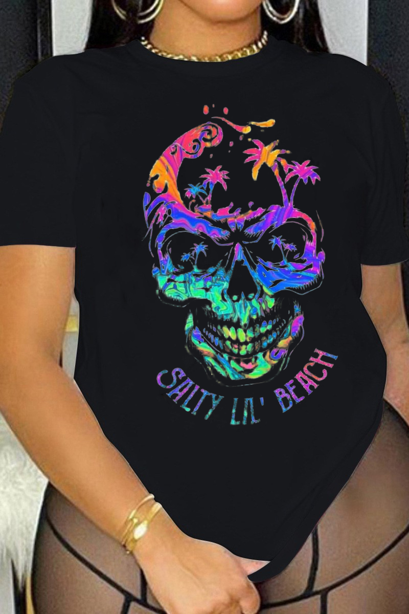 Tag | Short Sleeve , Patchwork , Cotton , O Neck , Positioning Print , Pullover , Street , Regular sleeve , Regular , Small Elastic , Skull |