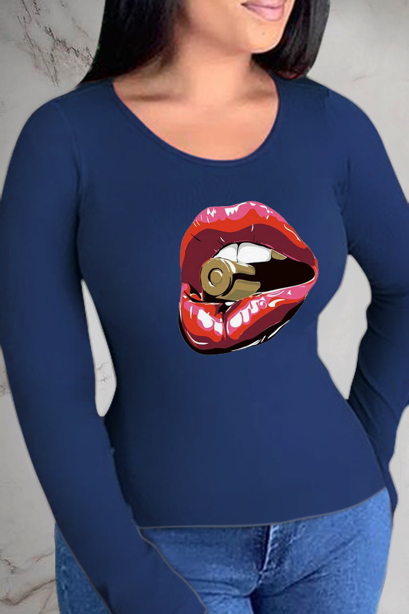 Product Name | Navy Blue Street Lips Printed Patchwork O Neck Tops |
