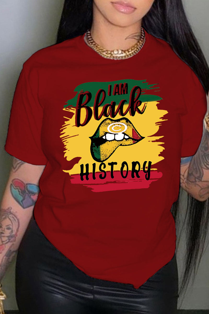 Product Name | Burgundy Casual Print Patchwork O Neck T-Shirts |